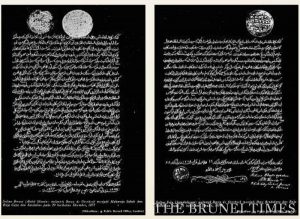 On the left is the first concession treaty between Sultan Abdul Momin of Brunei on 29 December 1877, appointing Baron de Overbeck as the “Maharaja Sabah, Rajah Gaya and Sandakan”.