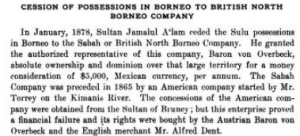 On the right is the second concession treaty that was signed by Sultan Jamal ul-Azam of Sulu on 22 January 1878 appointing Baron de Overbeck as “Dato Bendahara and Raja Sandakan”.