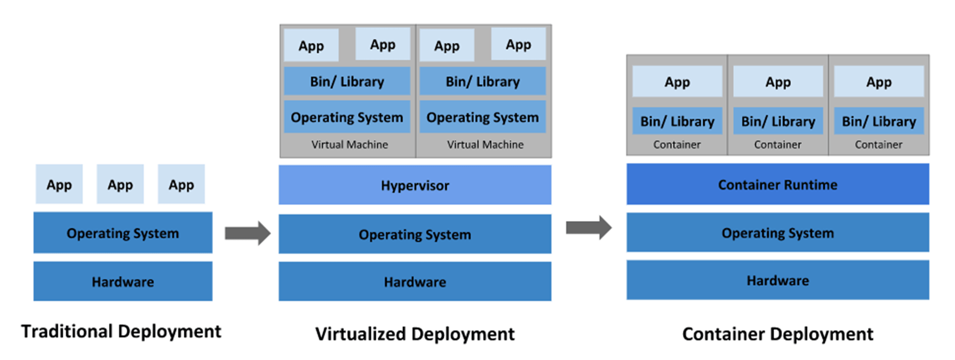 The picture above describes the transformation of infrastructure from time to time, from traditional to virtualized and container deployment, and nowadays, all of the containers that we have deployed to serve our application will be managed by Kubernetes.