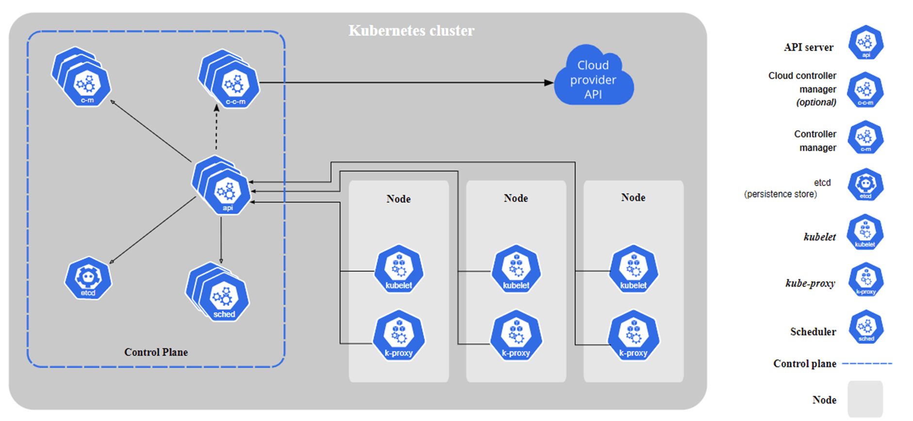 - Cloud Controller Manager: “It embeds cloud-specific control logic. The cloud controller manager lets you link your cluster into your cloud provider’s API, and separates out the components that interact with that cloud platform from components that only interact with your cluster. The cloud-controller-manager only runs controllers that are specific to your cloud provider