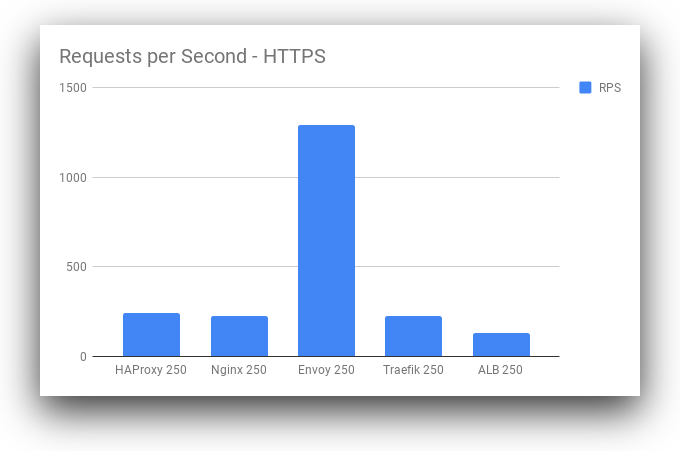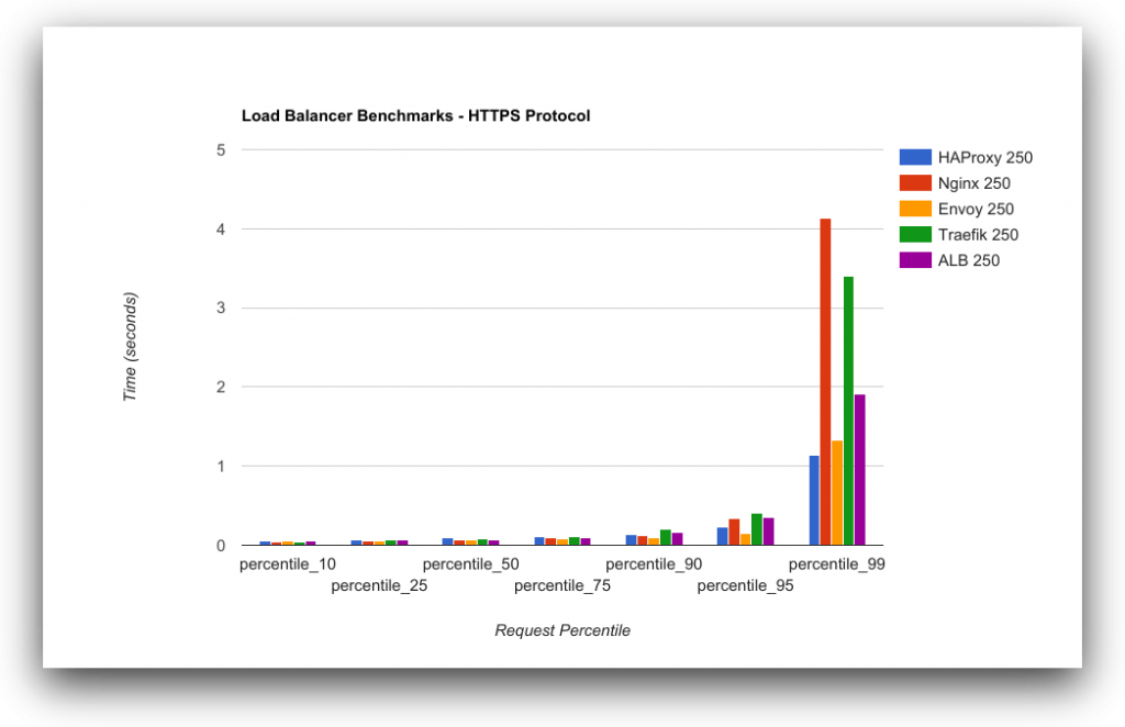 Surprisingly, Envoy has a far higher throughput than all other load balancers at the 250 concurrency range. While Envoy is also higher at other concurrency levels, the magnitude of the difference is especially high at the 250 concurrency level. This may be due to some intelligent load balancing or caching inside of Envoy as part of the defaults. It warrants further investigation to determine if this result is representative of real-world performance outside our limited benchmark. If so, Envoy deserves the attention it’s getting in the Ops community. Traefik stays more consistent under load than Nginx and HAProxy, but this may be mitigated by more optimized configuration of the other load balancers. Now, let’s look at HTTPS: